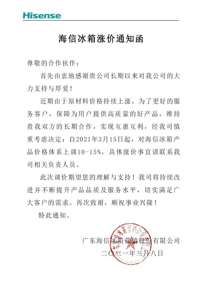 到目前为止,家电的涨价趋势依然没有停止,2021年1月15日,TCL宣布对冰箱、洗衣机、冷柜等产品涨价5%-15%;2月28日,美的冰箱事业部发布的《美的冰箱涨价通知函》,宣布自3月1日起,美的冰箱产品价格体系上调10%-15%。