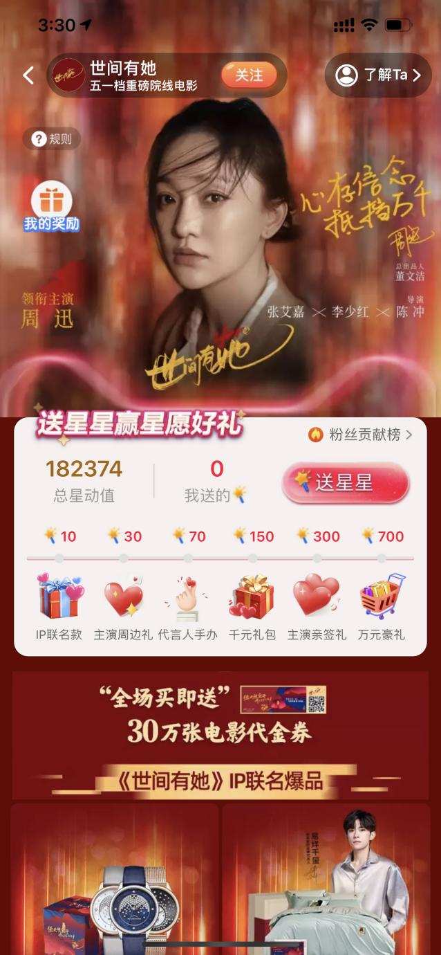 创新玩法打通站内链路有关注过天猫的朋友可能了解,从2018年启动「天猫全明星计划」开始,就致力于打造以明星为基础的内容商业链条。希望能通过自身超级平台的影响力吸引到更多明星资源的加入,来为更多的品牌赋能。同时将品牌的代言人资源吸纳到「天猫全明星计划」中反哺平台,形成一套从流量到商业的完整营销闭环。而本次,「天猫全明星计划」与影视作品《世间有她》达成合作,正是对这种商业营销闭环模式一种新的尝试。借电影势能,赋能商家在「天猫全明星计划」的互动加持下,天猫平台的商家一起参与到与《世间有她》的传播合作之中。只要在淘宝或天猫搜索「世间有她」,即可参与到为电影助力的活动中。不仅为粉丝们带来了IP联名的爆款商品,而且在购买和助力的同时还有30万张电影代金券的送出。同时还有周边礼品、代言人手办、亲笔签名礼品等诸多福利。
