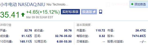 新浪科技讯 3月9日晚间消息,小牛电动涨幅扩大至15%,报35.41美元,当前市值26.47亿美元。