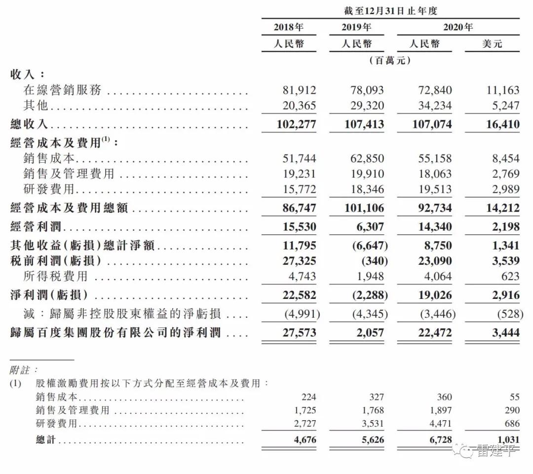 于2018年、2019年及2020年,归属百度集团股份有限公司的净利润分别为276亿元、21亿元及225亿元(34亿美元)。