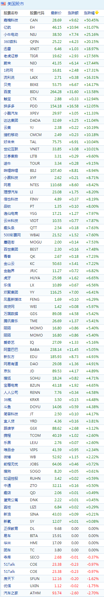 中概股中涨幅最大的是嘉楠科技,涨幅达50.45%,新能源股中,蔚来汽车大涨17.44%,报41.35美元;小鹏汽车涨11.33%,报29.97美元;小牛电动涨25.61%,报38.5美元。