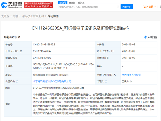 新浪科技讯 3月10日上午消息,天眼查App显示,3月9日,华为技术有限公司公开一项名称为“可折叠电子设备以及折叠屏安装结构”的专利,专利公开号为CN112466205A,申请日期为2019年9月6日。