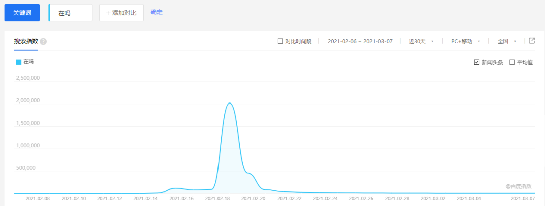 百度指数的“在吗”相关指数也显示,“在吗”热度自2月17日开始飙升,在18日达到顶峰后便一落千丈。也就意味着,这场活动从引爆社交媒体,再到其销声匿迹,前后不过3天时间。