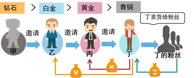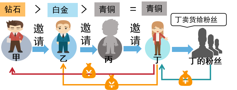 同样的道理,如下图,若甲乙丙丁等级从高到低排列为钻石>白金>青桐=青铜;丁卖货给粉丝,丁能赚零售收益和分佣,丙等级没有大于下级丁,则丙不能享受分佣,甲和乙享受分佣。