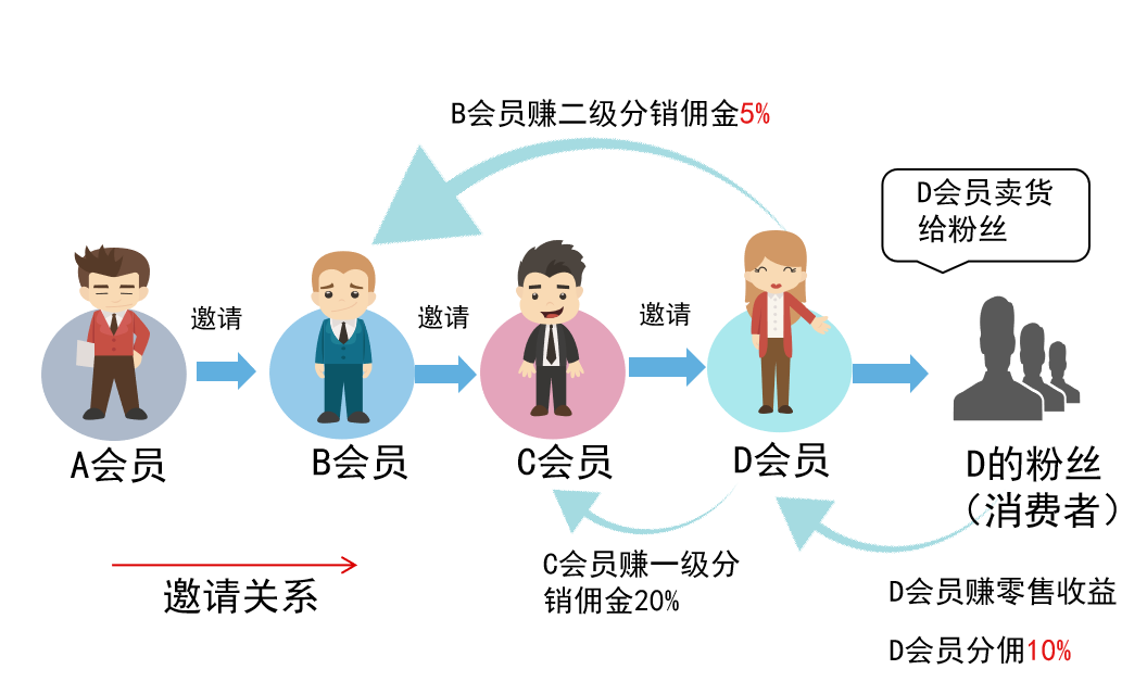 级,设置会员自购佣金10%,一级分销佣金20%,二级分销佣金5%。举个栗子,如图A会员邀请B会员加入,B会员邀请C会员加入,C会员邀请D会员加入。