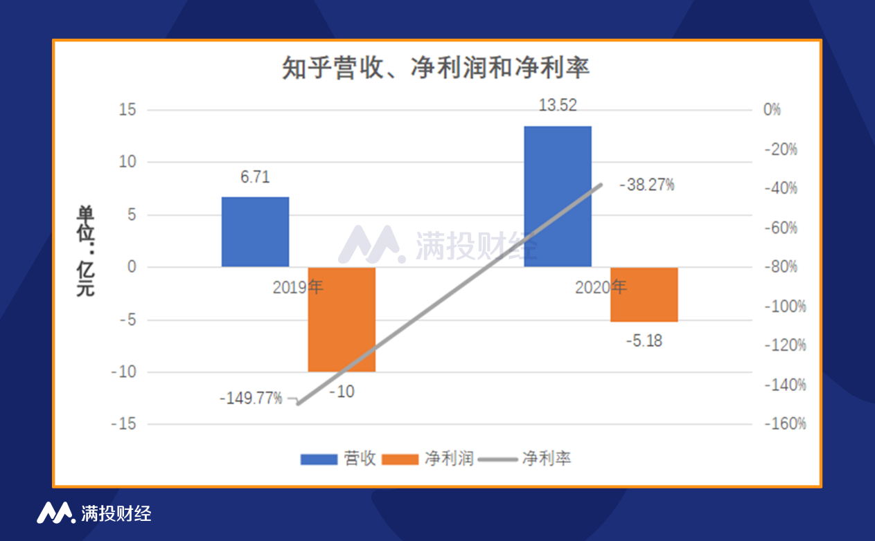 翻开知乎招股书,2019年和2020年,知乎营收分别为6.71亿元和13.52亿元,同比增长101.49%;净利润分别为-10亿元和-5.18亿元,两年亏损超15亿元。近两年,虽然知乎而道收入增长非常迅猛,但依旧处于亏损状态,好在2020年的亏损同比收窄近50%。