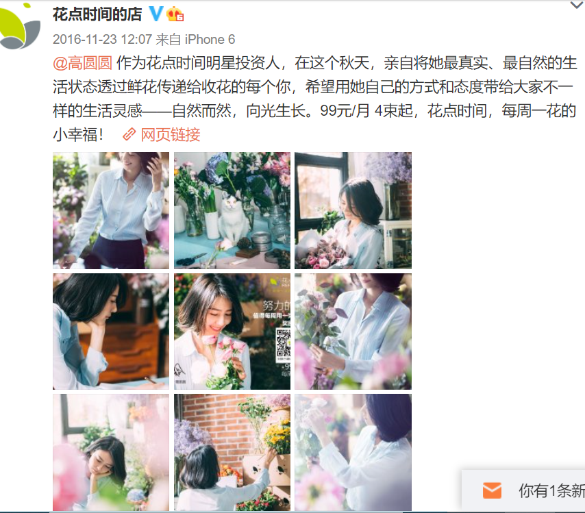 2016年11月,花点时间在微博上发布了一组高圆圆的代言照片。高圆圆不仅是代言人,也是花点时间天使轮和A轮投资方。