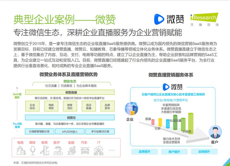 作为企业直播SaaS服务商的代表,微赞基于微信集合内容、互动、电商等功能特点,创新性依托微信生态,建立了以企业直播为主的帮助企业获客和品牌营销的SaaS工具。微赞解决了企业引流、互动、营销、变现等综合业务场景需求,在企业直播SaaS服务上达到行业领先。