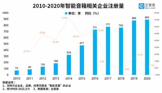 从近十年我国智能音箱相关企业的年注册量变化来看,企查查数据显示,2016年行业进入快速发展期,企业年注册量首次突破700家,同比上升53.2%。2020年,许多企业抓住疫情期间消费者的居家娱乐需求,智能音箱在海外打开了销路,全年注册量也达到十年来最高的893家,同比增长1.5%。