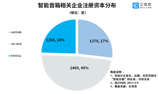 从注册资本分布来看,企查查数据显示,我国智能音箱相关企业中共有49%的企业注册资本在100万-500万之间,注册资本在100万之内的占比27%,而其他的24%的企业注册资本在500万以上。