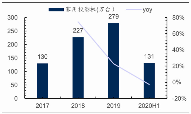 根据IDC数据,2019年我国投影设备出货量为462万台,2011-2019年复合增速超过14%。其中,2019年家用型(消费型)投影设备出货量为279万台,在2017-2019年则以46.%CAGR增长,需求端似乎也在逐步验证家用投影仪的崛起。