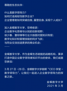 诚邀您参加:3月27日-28日,金蝶数字大学首期“CEO学堂-数字领导力”课程,让我们一起进入企业数字领导力的探索之旅。