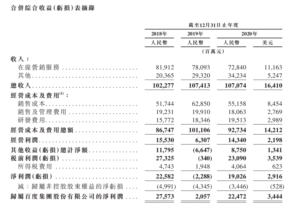 2018年至2020年,百度核心业务的收入分别为783亿元、797亿元及787亿元;归属百度核心业务的净利润分别为336亿元、76亿元及265亿元。