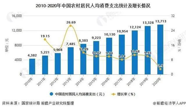 下沉市场是个掘金宝地,不论是用户消费潜力还是市场空间均有待挖掘。2020年,全国居民人均消费支出21210元。其中,城镇居民人均消费支出27007元,下降3.8%,扣除价格因素,实际下降6.0%;农村居民人均消费支出13713元,增长2.9%,扣除价格因素,实际下降0.1%。