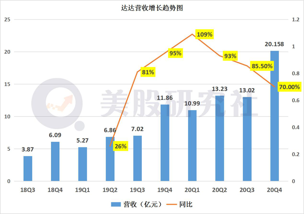 财报显示,达达集团2020年第四季度的总营收为20.158亿元,与去年同期相比增长70%,高于市场预期的20.12亿元;从20Q1到20Q3季度,达达集团营收分别是10.996亿元、13.23亿元、13.02亿元。在营收层面,达达集团连续几个季度实现稳定增长。