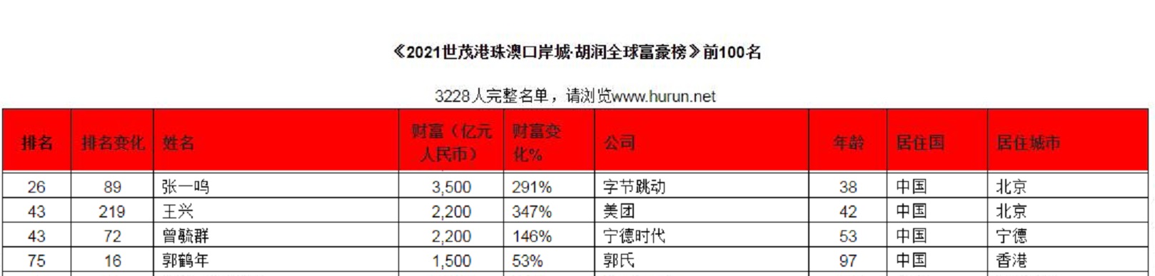 值得一提的是,在刚刚发布的《2021世茂港珠澳口岸城·胡润全球富豪榜》的前100名中,闽商占重要的四席:分别是:字节跳动的张一鸣以3500亿元财富位列第26位,中国第5位,闽商第1位;美团的王兴和宁德时代的曾毓群都以2200亿元财富并列第43位;郭鹤年以1500亿元财富位列榜单第75位等。