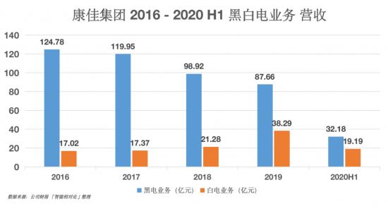 据2020年半年报显示,创维集团实现营业额159.8亿元,同比下降7%。以电视为主的多媒体业务收入93.94亿元;以白电为主的智能电器业务收入则只有18.8亿元。