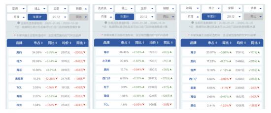 根据奥维云网的数据显示,2020年12月线上市场洗衣机均价同比提升10.2个百分点;空调行业均价同比上升19.3%。线下市场洗衣机行业均价同比增长8.2个百分点;空调行业均价同比上升9%。