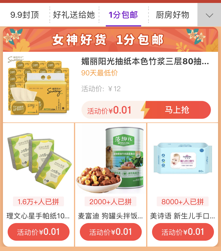 刚注册成功,平台就提示有1分钱的商品可以买,我随便选了个最不嫌多的面巾纸,居然还能包邮。而且,看群里的姐妹说,她之前囤零食的时候发现,京喜和拼多多搜同一款,虽然表面上看价格是一样的,但实际上京喜能返回几块钱,无形中就比拼多多便宜了。