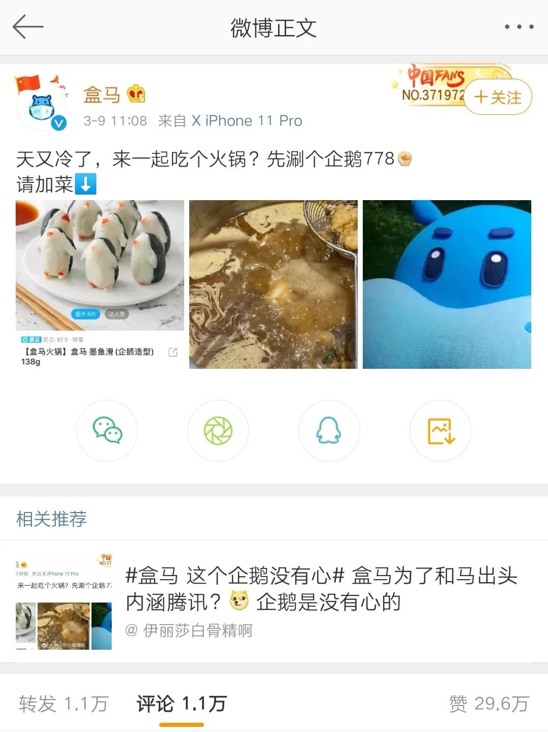 看到盒马这条微博内容的,大家很容易把其中的企鹅和另一家互联网大公司腾讯联系在一起,不明就里的会以为是不是阿里系和腾讯又有什么事情要发生。因此,这个简短的微博文案,议题设定的还是很好的,引发了大家的好奇(瓜众们从来都是看热闹不嫌事大的,特别是大厂之间的热闹)。