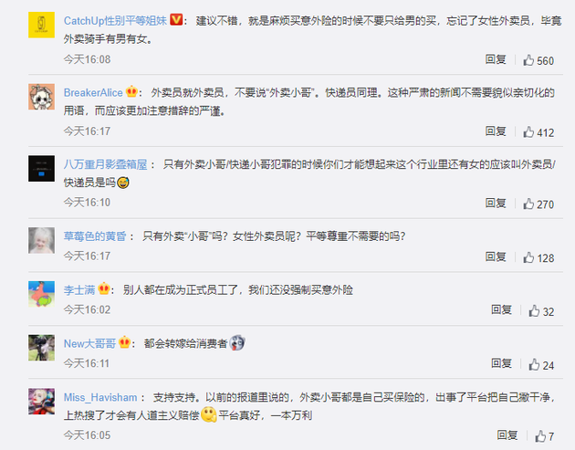 对此,有微博网友表示:“ 建议不错,就是麻烦买意外险的时候不要只给男的买,忘记了女性外卖员,毕竟外卖骑手有男有女。”也有网友表示“这个很有必要,多一份保障”。