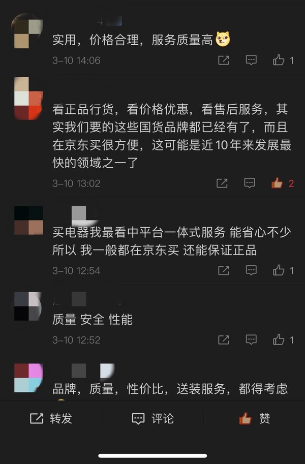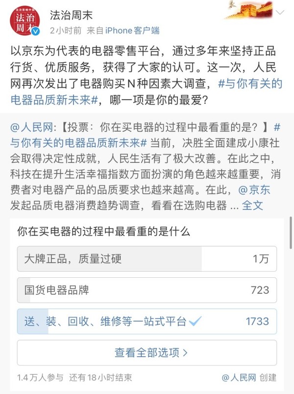 这不,最近人民网官方微博就发起了一场特别的#与你有关的电器品质新未来#投票调查,吸引了大量网友的关注和参与。针对大家关注度较高的选购电器的主要因素,投票选项中包含了大牌正品,国货电器品牌,一站式平台以及配送速度、退换货服务,价格优惠等多项内容。