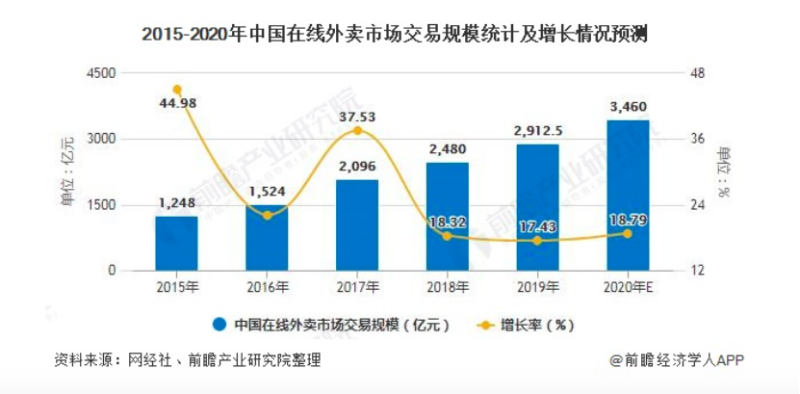 随着外卖用户规模的不断增长,外卖行业的交易规模也保持稳定增长态势。前瞻产业研究院在一份报告中提出,根据网经社数据显示,2019年我国在线外卖行业的交易规模达2912.5亿元,同比增长17.43%,预计2020年行业交易规模将达3460亿元,同比增长18.8%。