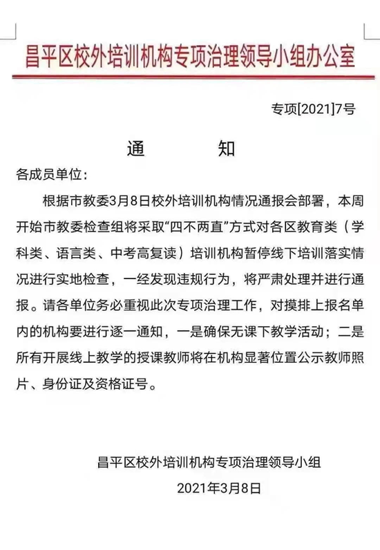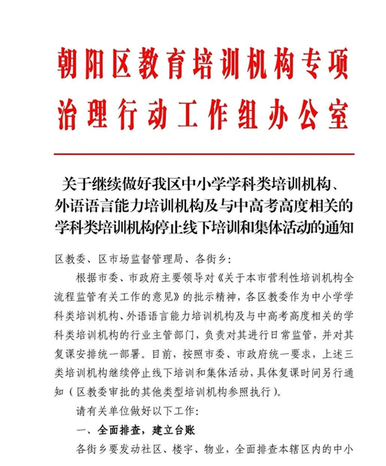 网上流传的文件名为《关于继续做好我区中小学学科类培训机构、外语语言能力培训机构及与中高考高度相关的学科类培训机构停止线下培训和集体活动的通知》(下称“通知”)。