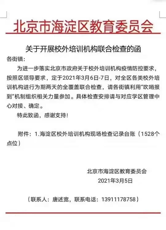 财联社(记者 孙诗卉 徐海东;研究员 毛建慧)讯,昨日,一则北京部分区域要求对线下培训机构全面停课排查的消息引起了轩然大波,据财联社记者多方求证,包括紫光学大相关人士在内的多位教育界从业者表示,确有此事,且目前自己所处机构在北京尚未复课。