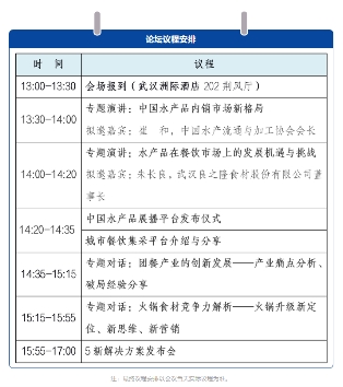 会议内容主要围绕当前经济形势、内循环新格局和市场需求,拟邀请国内水产、供应链、团餐、食品加工等领域的知名专家、行业领袖进行分析与解读;其次围绕水产品在餐饮市场上面临的发展机遇与挑战、水产品精深加工、供应链创新、用户需求与场景化联动等热点问题,拟邀请行业相关专家、食品研发领域技术精英、知名企业代表等进行演讲,并就典型餐饮场景下的食材需求进行深入交流与分享;另外,还会举办5新解决方案发布会,分享市场拓展解决方案,赋能新餐饮。