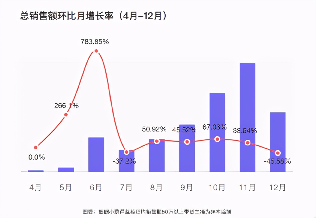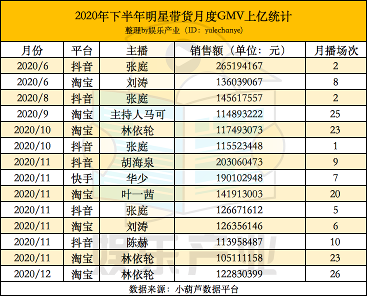 据小葫芦数据统计,2020年下半年,月度GMV上亿的明星有14个名额,11月有7位明星月度,而12月仅1位。