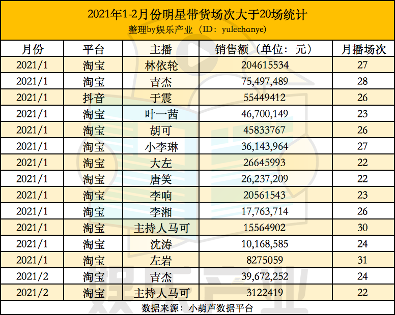 仅从明星直播场此来看,下跌就较为严重。在2021年1月份,月均场此稳定在20场以上的,有13位明星,而到了2月,只有吉杰和主持人马可。这两位相较1月满勤直播,受2月份因春节假期的影响,直播次数至少减少了一周时间。