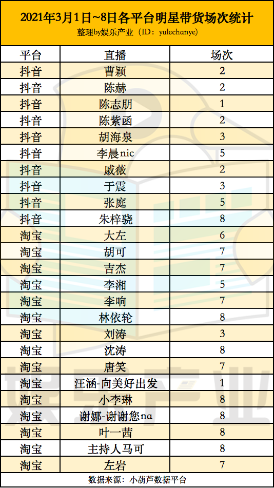 3月份日期截止3.8 节,据小葫芦数据统计,各家平台明星上线在播数中,抖音仅有10位,且一半人仅直播2场或以下,显然只是看重这一促销节点;淘宝在播明星数量最多,有15位且在播场次较为稳定,其中林依轮、刘涛、沈腾、小李琳、谢娜、叶一茜、主持人马可等均保持日播的状态,但在去年保持日播状态的汪涵已开始掉队,目前仅1场;而快手在明星主播总量本来就少的状况下,这次竞没有一位在播明星。