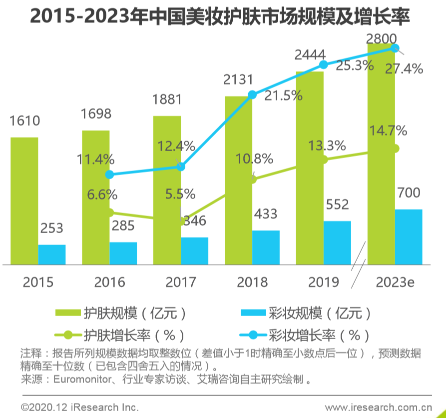 据艾瑞咨询数据,中国彩妆市场增速在2015就开始持续高于美妆护肤市场整体增速,预计2023年,中国彩妆市场规模增长率将高达27.4%。