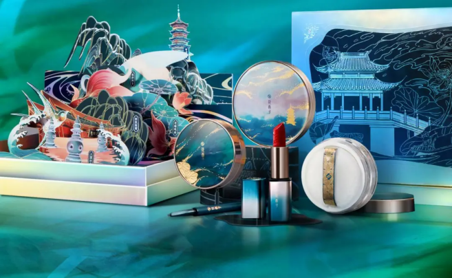 品牌LOGO上,花西子品牌LOGO取形江南园林的小轩窗;而将黛色作为品牌主色,也是取意于“略施粉黛+粉墙黛瓦”;在产品上,花西子将中国传统工艺运用到其彩妆设计中,如2019年4月推出“雕花口红”、2019年年末推出白鸟朝凤盘、2019年8月在七夕节推出琉璃礼盒、2019年11月,以“西湖十景”为灵感推出“西湖印记定制礼盒”、2020年4月推出东方定制礼盒、2020年推出同心锁礼盒,以及双十一推出苗族礼盒等;据悉,成立4年来,花西子已经推出数十款复刻东方传统工艺的彩妆产品。