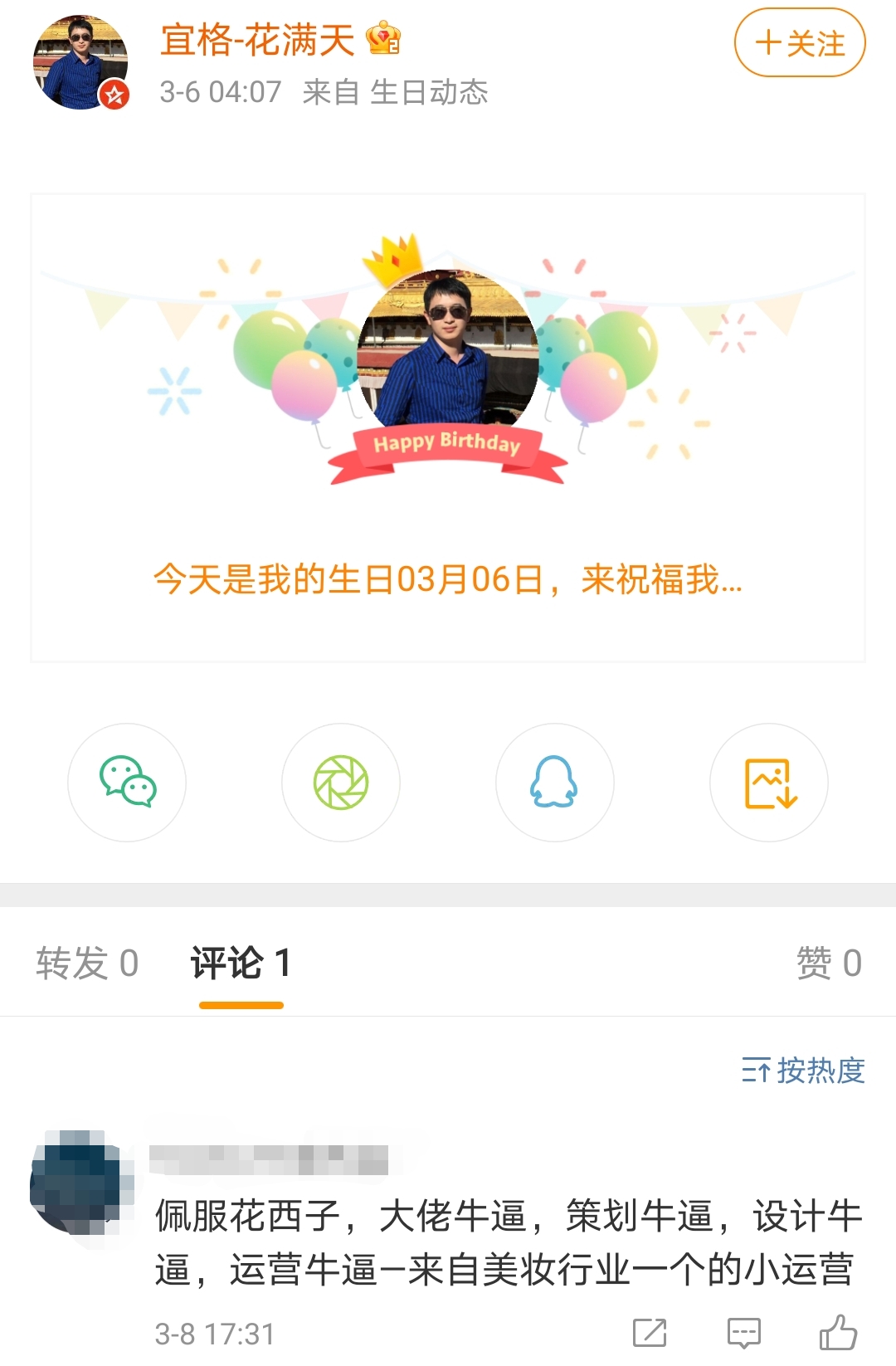相比花西子,外界对它的创始人花满天(吴成龙)知之甚少。这个站在花西子背后的男人是营销界一位低调的大佬,在其3月6日的生日微博动态下,有网友留言表示钦佩。