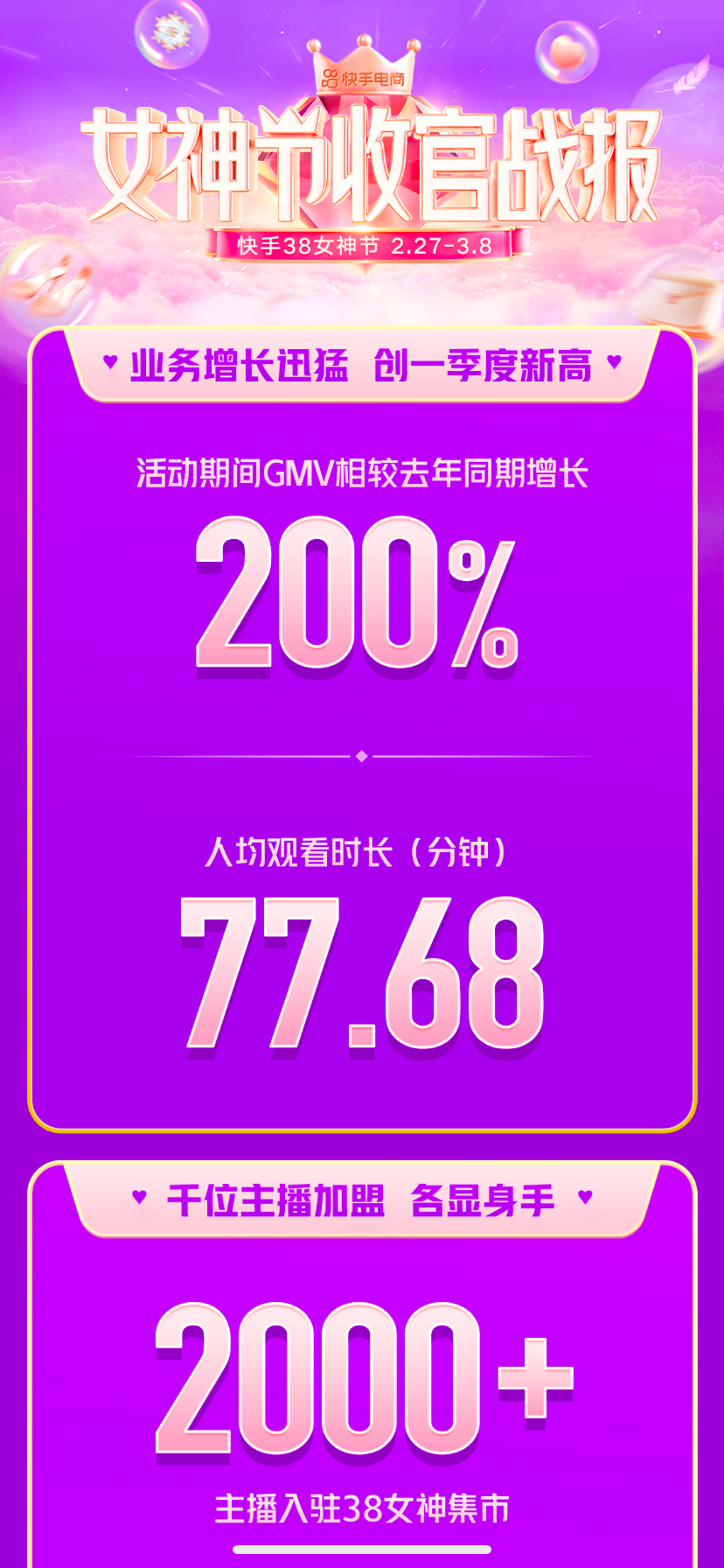 仅在刚刚过去的快手电商38女神节大促活动中,就有超过800位主播带来了自己的源头好货。同时,整个大促也再一次体现出快手电商的发展潜力:根据官方数据,活动期间快手电商GMV相较去年同期增长达到200%,12位主播在活动期间销量破亿。