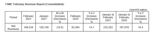 3月10日,台积电发布2月财报。综合来看,台积电今年2月的收入约为1065.3亿新台币(约合人民币245.6亿元),环比下降15.9%,同比增加14.1%。2021年1月至2月的收入总计为2332.8亿新台币(约合人民币537.9亿元),与2020年同期相比增长18.4%。