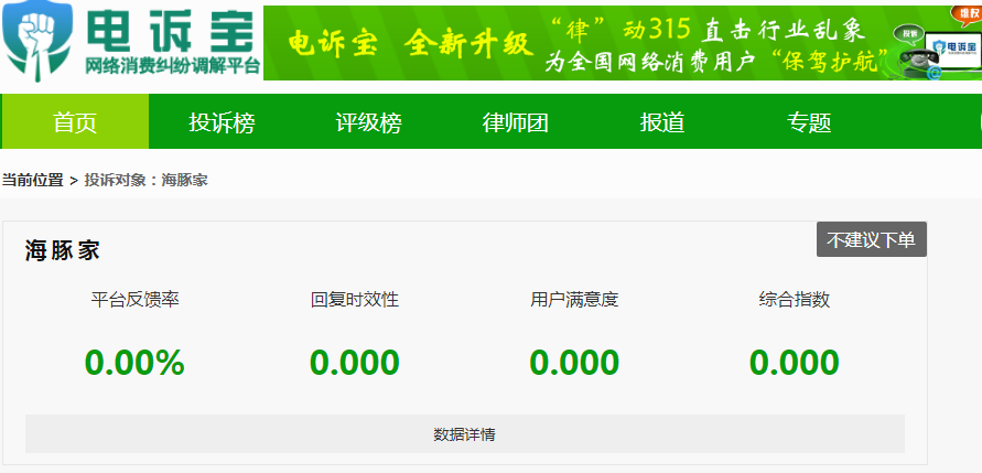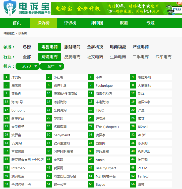 根据“电诉宝”受理的跨境电商领域用户有效投诉显示(依据投诉量排行),海豚家排名第五位。
