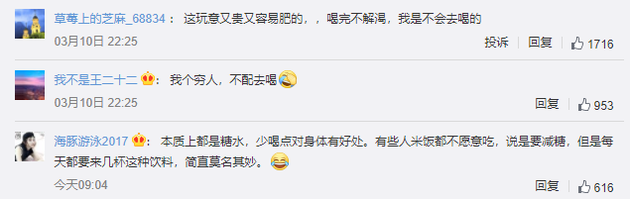 对于在年轻人在新茶饮上话费如此之多,不少网友评论表示“这玩意又贵又容易肥的,,喝完不解渴,我是不会去喝的”“我个穷人,不配去喝”“本质上都是糖水,少喝点对身体有好处。有些人米饭都不愿意吃,说是要减糖,但是每天都要来几杯这种饮料,简直莫名其妙”,对新茶饮的价格和健康均提出质疑。