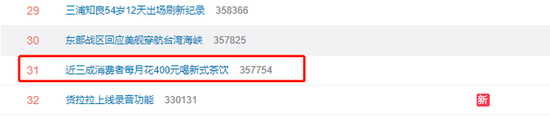 新浪科技讯 3月11日下午消息,#近三成消费者每月花400元喝新式茶饮#登上微博热搜,年轻消费者对新茶饮的消费能力再度引发网友关注。