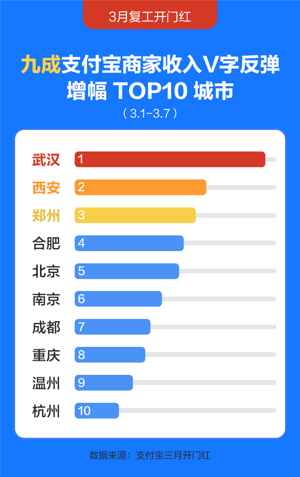 随着3月气温回暖,疫情防控进入常态化,各行各业的消费也迎来一波小高潮。3月11日,支付宝数字生活平台数据显示,3月以来全国近9成商家营收与去年同期相比实现V字反弹。