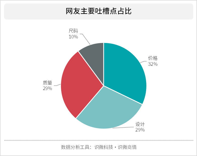 据统计,网友吐槽中,有32%的人认为Gap售价偏高;29%的人认为Gap产品设计不够吸引人,存在logo过大、设计单一等问题;另有29%的人认为其质量不过关,有易变形、褪色的缺点;还有10%的吐槽表示Gap的尺码过大,对于中国消费者并不友好。