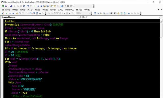 Private Sub CommandButton2_Click() '绘制条纹ColorX = Me.ComboBox1.ValueApplication.ScreenUpdating = FalseDim s As Worksheet, cell As Range, xcell As RangeSet s = ActiveSheets.UsedRange.DeleteDim iR As Integer, iC As Integer, r As Integer, c As IntegeriR = 22 '行数要单数iC = 20 '列数Set xcell = s.Range(s.Cells(1, 1), s.Cells(1, iC))With xcell.Merge.VerticalAlignment = xlTop.HorizontalAlignment = xlCenter.RowHeight = 75.Value = "江觅信笺用纸"With .Font.Size = 22.Name = "微软雅黑".Bold = True.Color = ColorXEnd WithEnd WithSet cell = s.Range(s.Cells(2, 1), s.Cells(iR, iC))For r = 1 To iRWith cell.Rows(r).RowHeight = 30.Borders.LineStyle = 0.Borders(xlEdgeTop).LineStyle = 1.Borders(xlEdgeBottom).LineStyle = 1.Borders(xlEdgeTop).Color = ColorX.Borders(xlEdgeBottom).Color = ColorXEnd WithNext rcell.ColumnWidth = 3Set cell = cell.Offset(iR, 0).Resize(1, iC)With cell.Merge.VerticalAlignment = xlCenter.HorizontalAlignment = xlRight.RowHeight = 30With .Font.Size = 12.Name = "微软雅黑".Bold = False.Color = ColorXEnd WithEnd WithSet s = NothingSet cell = NothingSet xcell = NothingApplication.ScreenUpdating = TrueEnd Sub