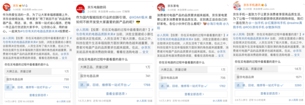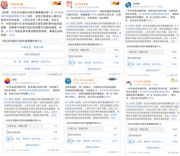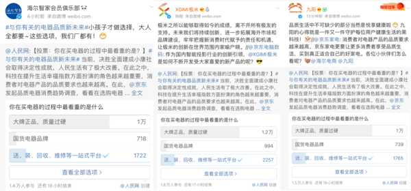 最近几天,很多网友都被人民网发起的一场#与你有关的电器品质新未来#投票活动刷屏了。而比投票现场更热闹的是,京东家电、京东电脑数码和京东手机官方微博不仅在第一时间转评投票,还拉来海尔、九阳、极米等多个知名电器品牌玩起了趣味在线互动,幽默的话风、和谐的氛围引得大批网友纷纷感慨:没想到平日看起来严肃的大牌也有如此活泼的一面,这么高甜的互动真是磕到了!