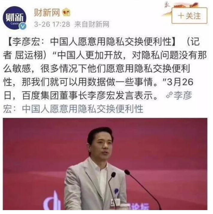 凡事月盈则亏,之前百度CEO李彦宏在某重要大型论坛上表示中国人对隐私问题没那么敏感,很多情况下愿意用隐私交换便捷性。此言迅速登上众多媒体头条,引来不少网友吐槽。