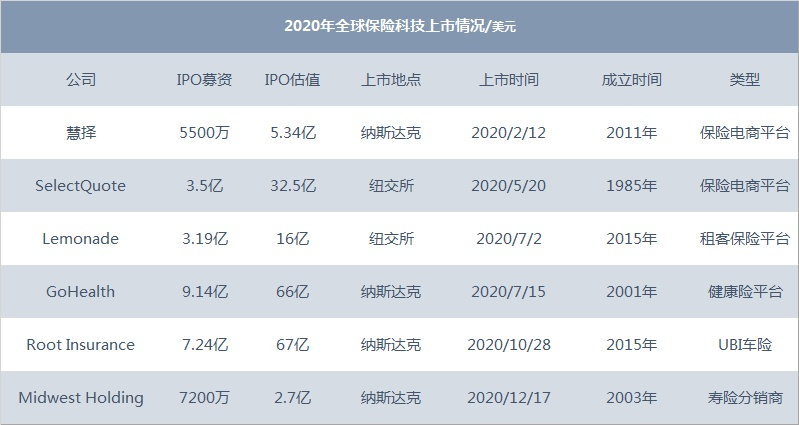 2021年以来,随着二级市场进入估值调整阶段,去年一直被鼓吹的估值泡沫迎来了破灭,但是保险科技概念股却一直保持着喜人的涨势,而且这样的势头,不仅存在于国内,在全球范围都出现了保险科技公司领涨的态势,2020年,全球共有6家保险科技企业成功IPO,市值超过1200亿元,其中Oscar Health在今年3月上市更是再次将保险科技概念烘托至顶峰。