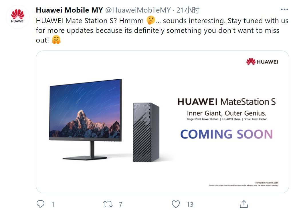 昨日华为在欧洲发布了 MateStation S 台式机,产品将于 6 月上市,搭载 6 核 12 线程 AMD R5-4600G 处理器。与此同时,华为马来西亚官方账号也发布了预热海报,表示华为 MateStation S 台式机也将在马来西亚发布。
