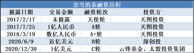 据企查查数据显示,2020年包括喜茶、奈雪的茶、蜜雪冰城等均有融资进账,其中最大的是奈雪的茶,其在12月30日获得云锋基金和太盟投资的超1亿美元C轮融资。