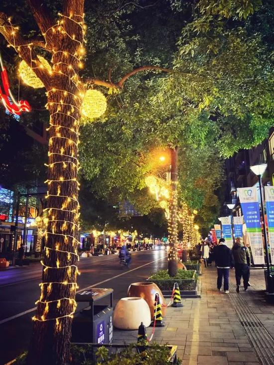 改造后的大学路“焕然一新”。这里的行道树被鹅黄色灯光包裹得闪闪发亮,路边的门脸儿透出五彩斑斓灯光,行人不急不缓地走着,四目相对时,彼此都昂着年轻的脸庞,一切都充满着朝气和活力。